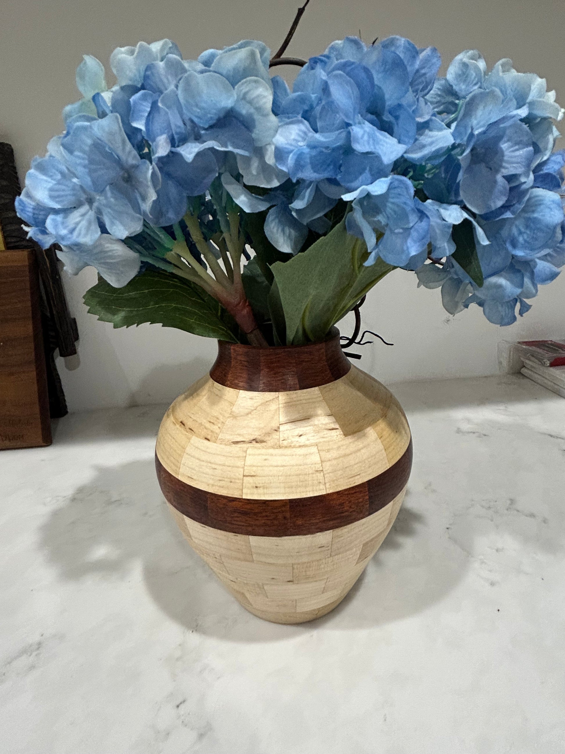 Add a unique touch to your home decor with our Handmade Wood Vase, crafted from 100 individual pieces of Brazilian cherry and soft maple. Each vase is a one-of-a-kind piece of art, handcrafted by published professional cabinetmaker Brian Michaelis through the intricate technique of segmented woodturning. Elevate your space with this truly exceptional and masterfully crafted vase.